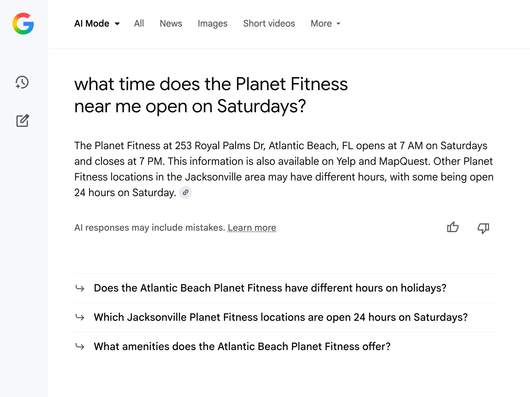 Ask Google's AI Mode what time your gym opens on Saturday, and you'll get location details, holiday schedules, and alternative locations when all you needed was "7 AM."