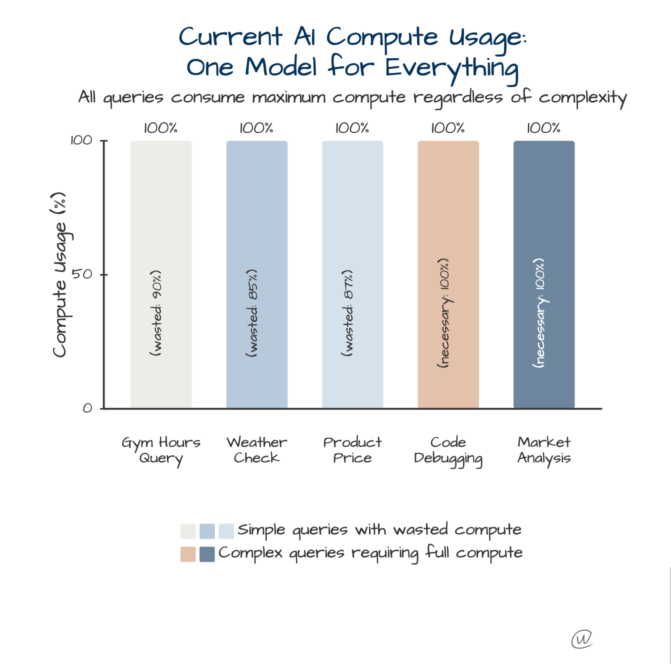 Model selection today happens once at conversation start and never adjusts. You pick GPT-4 or Claude Opus, and that's your model strength for the entire session, whether you're asking for a toaster recommendation or debugging complex code.
