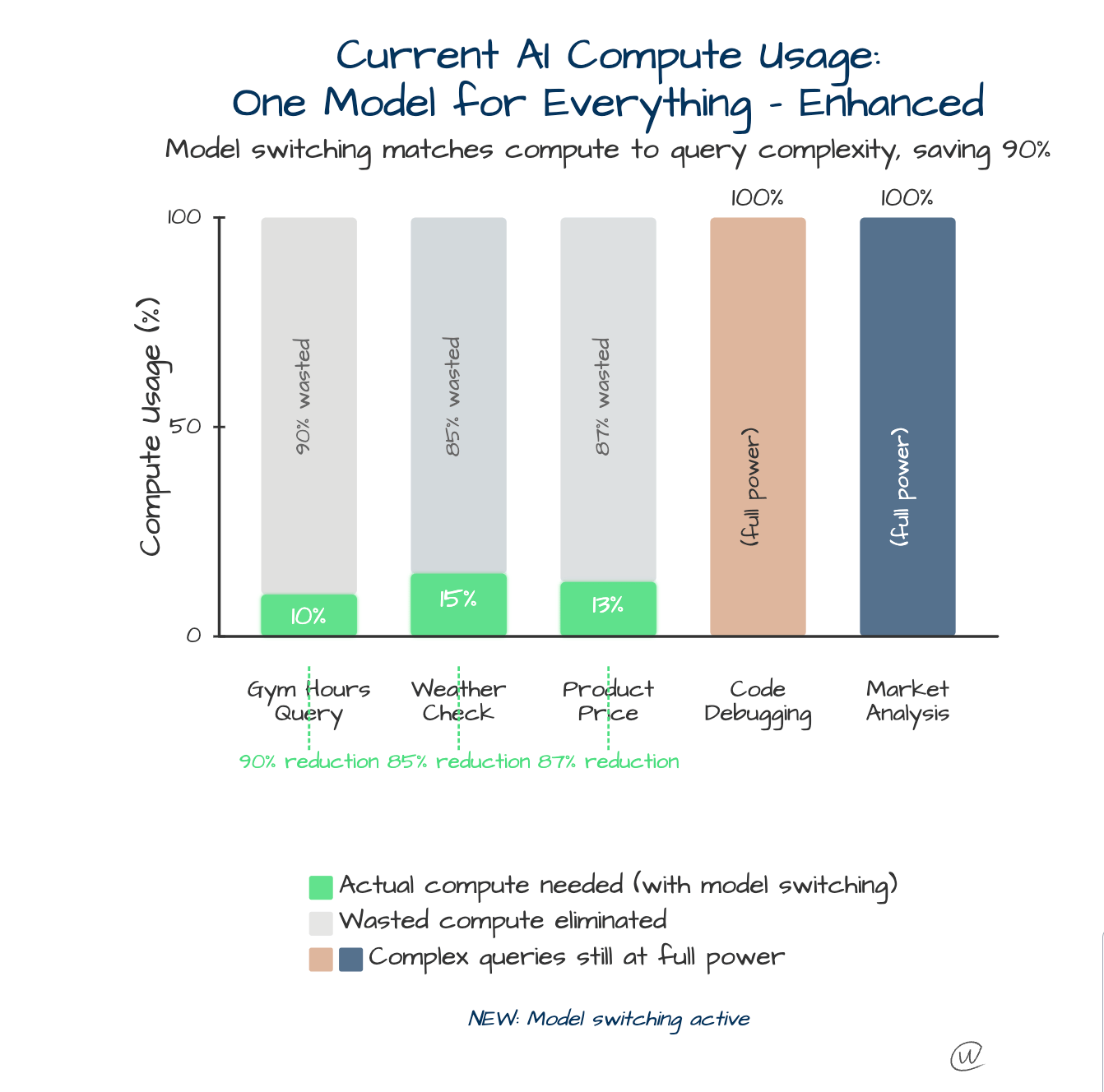 Track compute patterns in your AI usage. Document where simple questions receive complex answers because this reveals waste patterns that cost real money. Look specifically at customer service interactions, FAQ responses, and basic data retrieval tasks where structured responses would suffice. Every multi-paragraph response to a binary question represents unnecessary compute spend that automated switching will eliminate.