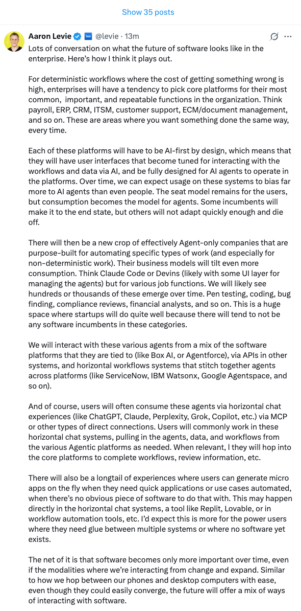 Aaron Levie offers the counterargument, and it’s worth the read. Enterprises need deterministic workflows for high-stakes operations like payroll, ERP, and customer support. These platforms will become AI-first but maintain consistent interfaces.