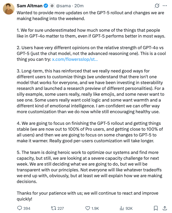 The capacity challenge Altman mentions matters more than most realize. API traffic doubled in 24 hours, according to his post. They're making tradeoff decisions between serving everyone adequately versus giving power users precisely what they want.