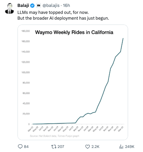 Balaji Srinivasan shared a chart showing Waymo's weekly rides in California. Look at it closely.
