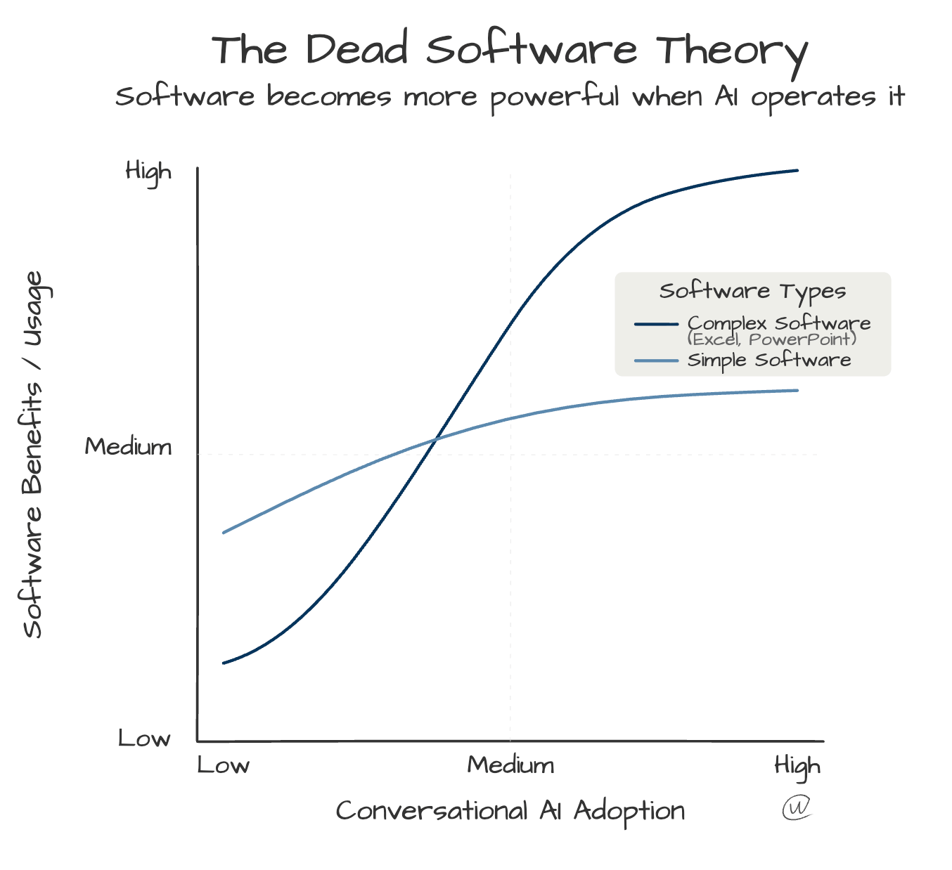 The dead software theory means that everyone will operate at a higher level, turning conversational ideas into reality.