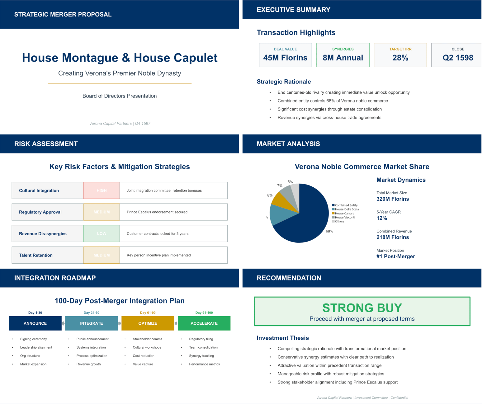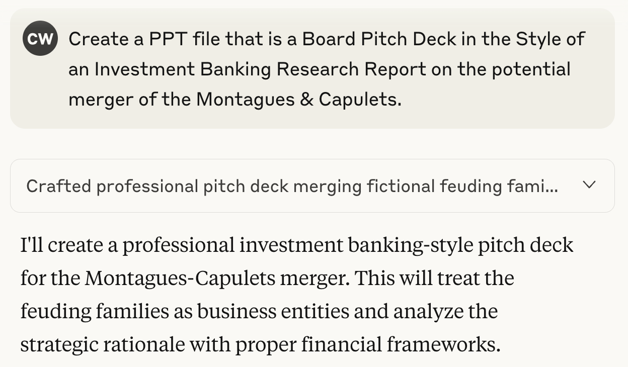 Claude generated a complete PowerPoint file, including a deal rationale, synergy analysis, and a pro-forma capitalization table. It created a plausible business case for a fictional merger from a 400-year-old play.