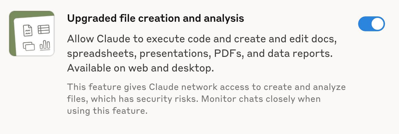 This isn't a distant future. It's happening now. Ethan Mollick recently pointed out a new capability in Claude that I hadn't realized was already live. Claude can now generate entire PowerPoint presentations and Excel spreadsheets from a simple prompt. Tucked away in Claude's settings is a beta feature that allows it to produce these complex files.