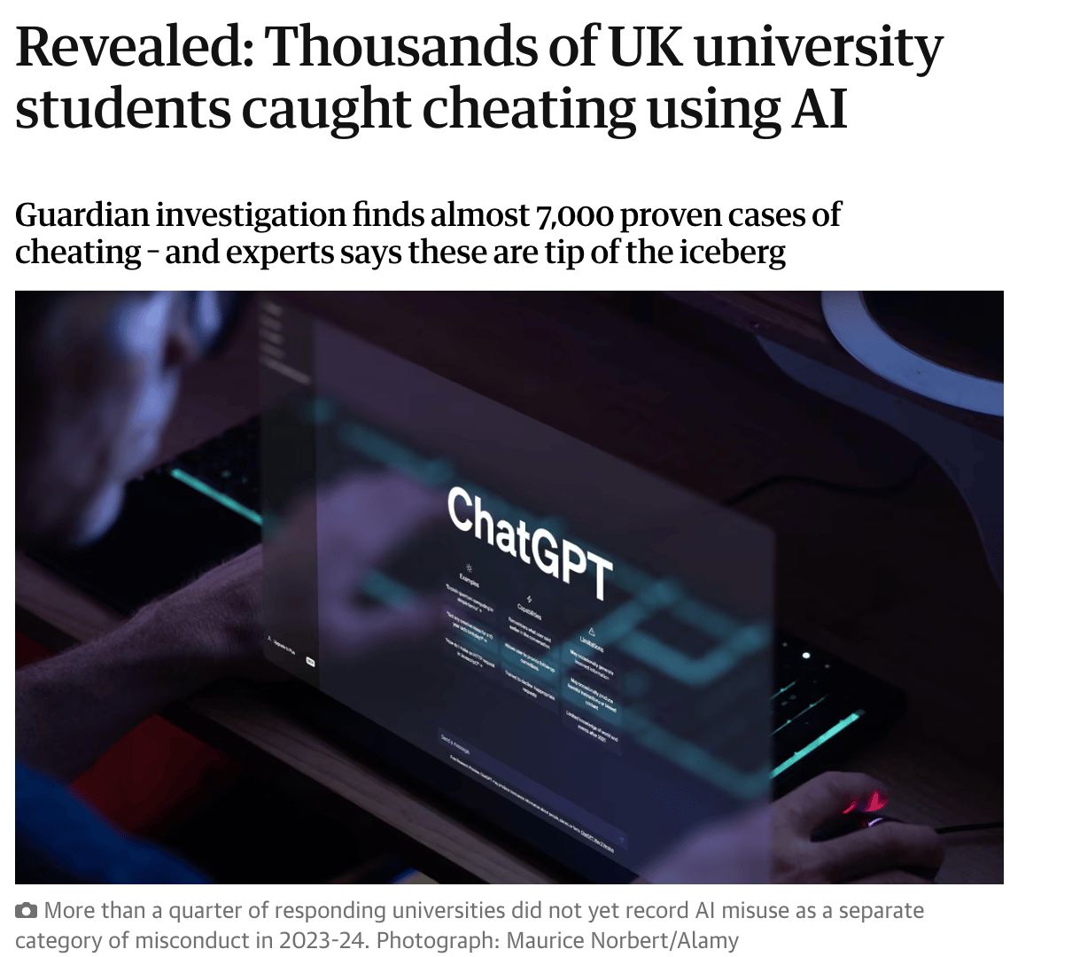 A Guardian investigation months back found that nearly 7,000 UK university students were caught cheating using AI in the 2023-24 academic year. Experts say this represents the tip of the iceberg. More than a quarter of responding universities did not even record AI misuse as a separate category of misconduct.