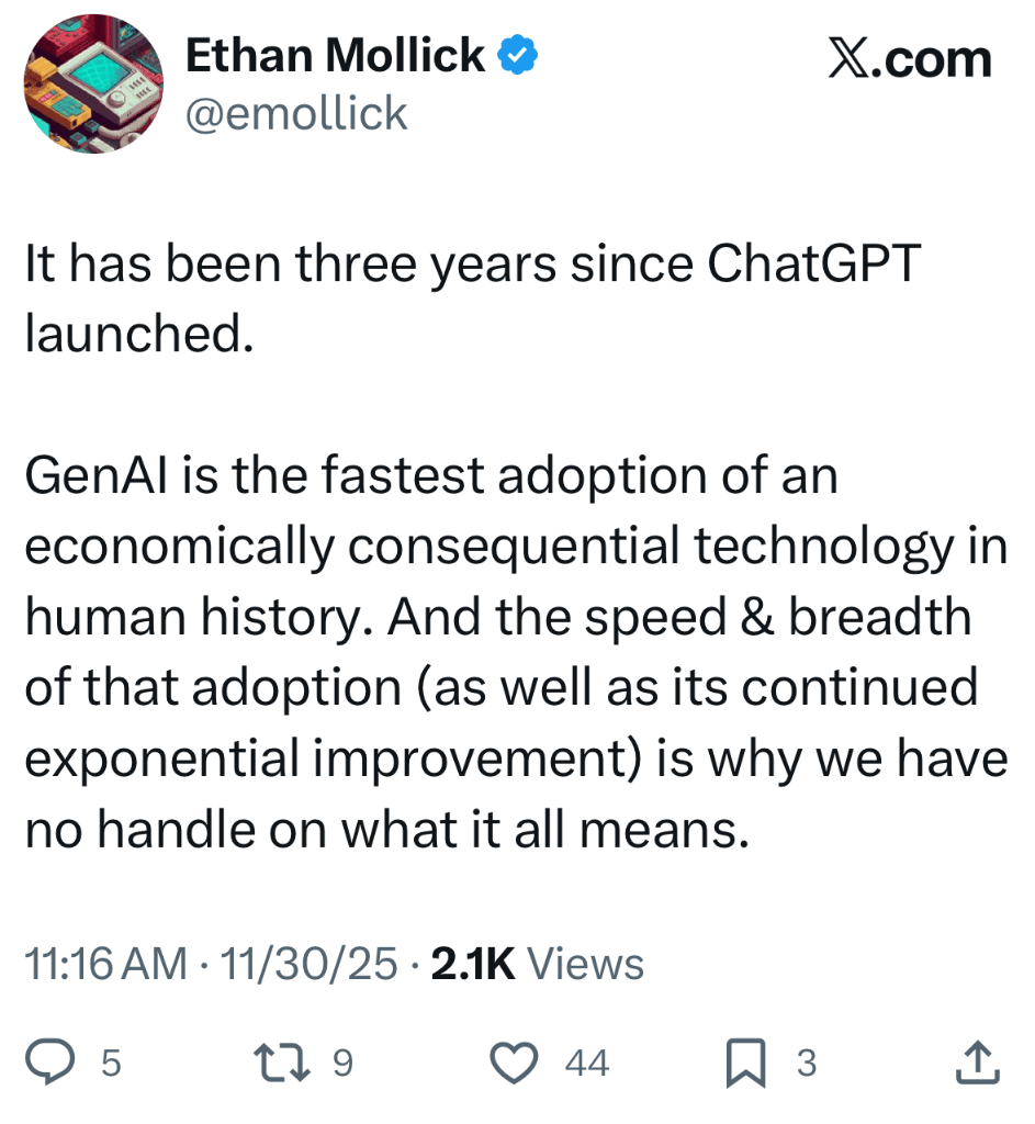 As Ethan Mollick pointed out this morning, we are witnessing the "fastest adoption of an economically consequential technology in human history." He is right. However, looking at the charts and the adoption curves misses the visceral reality of what is happening as the holiday season begins.