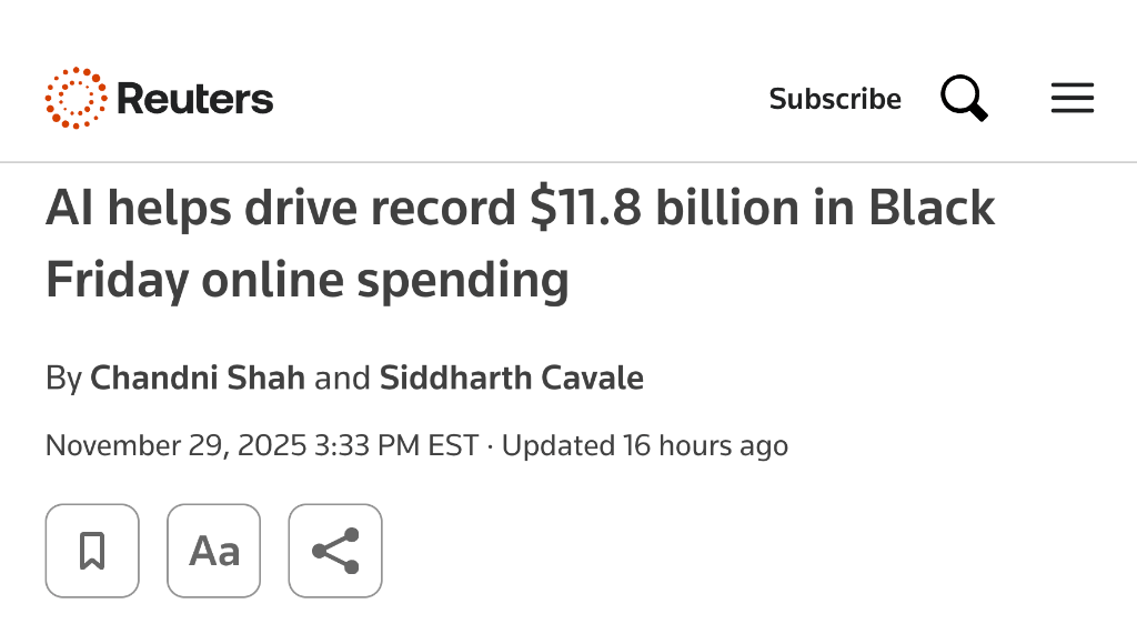 The headlines from Black Friday tell a story most retailers are still trying to decode. Reuters reported a record $11.8 billion in online spending, explicitly driven by AI.