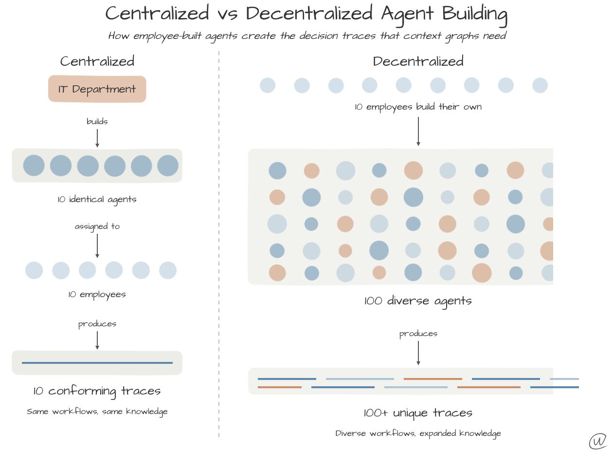 The centralized approach fails to expand knowledge in the same way. The conforming users generate conforming traces. The agent-building employees encode decision traces that nobody at the top could have specified in advance.